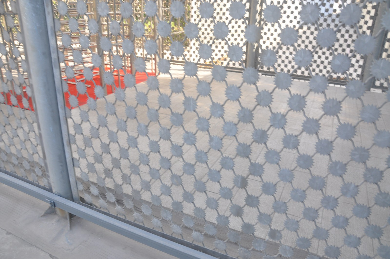 太陽花鋼網(wǎng)墻規(guī)格尺寸: 2.24*1.63米、 1.63*163米、3.34*2.24米、3.34*1.02米、3.34*1.63米等不同規(guī)格、絲經(jīng)不低于600#。梅花刺鋼網(wǎng)墻立柱采用Y型鍍鋅鋼管:壁厚150*150*8mm /網(wǎng)片邊框60*60*2.5m、Y型立柱安裝不銹鋼刀片刺網(wǎng)。