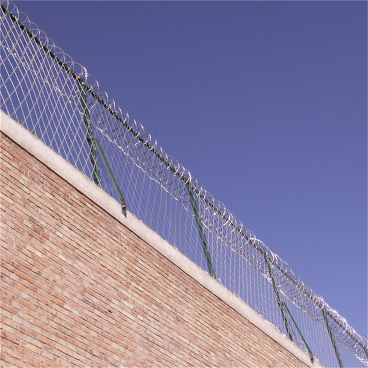 監(jiān)獄鋼網墻、看守所隔離網、機場圍界網等,大多在頂部用V型支架加裝監(jiān)獄專用不銹鋼刺刀圈,這種刺刀圈呈螺旋狀,一般多為不銹鋼材質,結構新穎、堅固緊密、網面平整、網孔均勻、刀鋒銳利、防攀爬、**腐蝕性強。