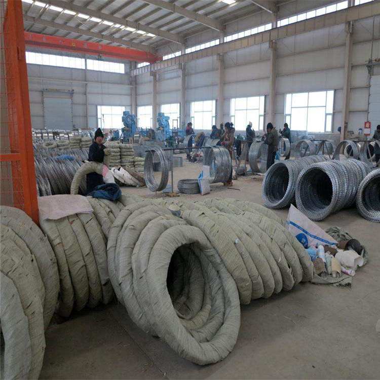 (1)、高鐵刺絲滾籠采用刀片刺繩繞圈后相臨兩圈每隔120°用刺絲連接卡固定,張開后形成蛇腹網(wǎng)狀,閉合后刀片刺繩圈徑為50cm,張開后每交叉圈安裝間距20cm,直徑不小于45cm。