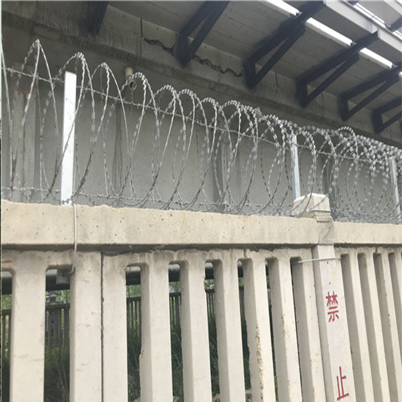 刀刺滾籠生產(chǎn)工藝 :刀片刺繩由熱鍍鋅板或不銹鋼薄板沖壓出尖銳的刀片狀,高張力鍍鋅鋼絲或者不銹鋼絲做芯線組合而成的防護(hù)產(chǎn)品,利用不銹鋼卡扣將刀片刺繩繞圈后相臨兩圈每隔120°用刺絲連接卡固定,張開后形成蛇腹網(wǎng)狀,閉合后刀片刺繩 圈徑為50cm,張開后每交叉圈安裝間距20cm,直徑不小于45cm。由于刺網(wǎng)造形獨(dú)特不易觸摸、形成立體圍護(hù)因而能達(dá)到極好的防護(hù)隔離效果,該產(chǎn)品具有嚇阻效果好、美觀、施工便利、線型可隨地勢(shì)變換、經(jīng)濟(jì)實(shí)用等優(yōu)異特點(diǎn)。