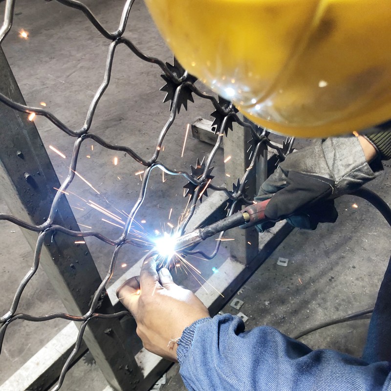Q195線材高壓焊接,每一個焊點附焊梅花刺一個。立柱采用Q235鋼管,規(guī)格:直徑80*80方管,方管厚度3mm。立柱高2.5米,間距3米,