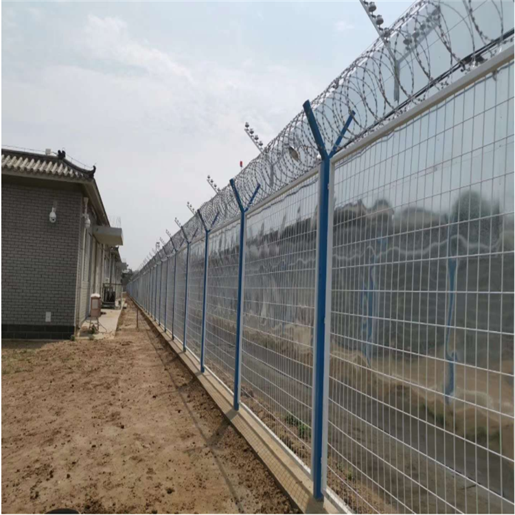 監(jiān)獄圍墻10米隔離網(wǎng)是由V型支架立柱,加強(qiáng)型焊接片網(wǎng),安全防盜連接件和熱鍍鋅刀片刺籠組成,強(qiáng)度和安全防御性級(jí)別很高。近年來,被廣泛應(yīng)用在監(jiān)獄,軍事基地等高安全場所。注:如果在監(jiān)獄護(hù)欄網(wǎng)頂部加裝刀片刺絲、刀片刺繩后又很好的增強(qiáng)了安全防護(hù)性能。采用電鍍、熱鍍、噴塑、浸塑等防腐形式,具有很好的抗老化、抗曬、耐候等特點(diǎn)。其產(chǎn)品造型美觀、花色多樣,既起到圍欄作用,又起到美化作用。由于具有安全性高、防攀爬能力好,網(wǎng)片連接方式采用特制SBS緊扣件,有效防止人為的破壞性拆卸,橫向四道折彎加強(qiáng)筋,使網(wǎng)面強(qiáng)度顯著增加。