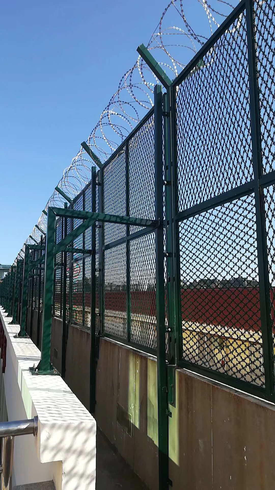 內(nèi)外墻巡邏道專用隔離網(wǎng)主要是采用高強度的刀片刺網(wǎng)與普通防護網(wǎng)的結(jié)合,由V型支架立拄,加強型焊接片網(wǎng),安全防盜連接件和刀片刺網(wǎng)組成。這樣的組合具有很好的嚇阻和防止攀爬的功能,慕源隔離網(wǎng)廠選用優(yōu)質(zhì)原材料更是保障了隔離網(wǎng)的質(zhì)量。刀片刺網(wǎng)是一種新型防護網(wǎng),由銳利尖角鍍鋅鋼板或不銹鋼薄板做刀片,鋼絲做芯線組合而成的防護器材。其突出的防攀爬效果使其成為三所一隊內(nèi)外監(jiān)墻巡邏道專用隔離網(wǎng)必備的組成部分??词厮?、拘留所、戒毒所、武警中隊,三所一隊內(nèi)外監(jiān)墻巡邏道專用隔離網(wǎng)常見規(guī)格:刀片刺網(wǎng):50cm-80cm直徑刀片刺網(wǎng),型號BTO-22,材質(zhì)為熱鍍鋅或304不銹鋼材質(zhì);網(wǎng)片:網(wǎng)片一般采用鋼筋焊接網(wǎng),也可采用鋼板沖壓網(wǎng)、直線刀片刺網(wǎng)、太陽花刀刺網(wǎng)等特殊型網(wǎng)片;