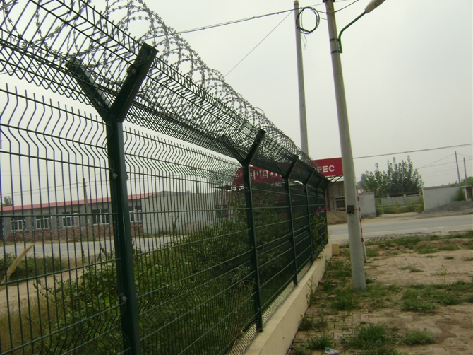 機(jī)場(chǎng)圍界和監(jiān)獄隔離網(wǎng)又稱作“Y型安全防御護(hù)網(wǎng)”,都是由折彎網(wǎng)片,V型支架立柱,加強(qiáng)型焊接片網(wǎng),上面有刀片刺繩(又稱刀刺網(wǎng),刀片護(hù)網(wǎng))安全防盜連接件組成強(qiáng)度和安全防御性級(jí)別很高。因立柱外形酷似英文字母Y,所以被稱為Y型安全防御護(hù)網(wǎng)。頂部加裝刀片刺絲、刀片刺網(wǎng)后又很好的增強(qiáng)了安全防護(hù)性能。產(chǎn)品造型美觀、花色多樣,既起到圍欄作用,又起到美化作用。由于具有安全性高、防攀爬能力好,網(wǎng)片連接方式采用特制SBS緊扣件,有效防止人為的破壞性拆卸,橫向2-4道折彎加強(qiáng)筋,使網(wǎng)面強(qiáng)度增加,每6米增加一根斜撐,這樣防風(fēng)性能也加強(qiáng)了。