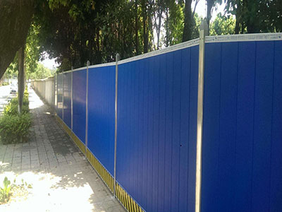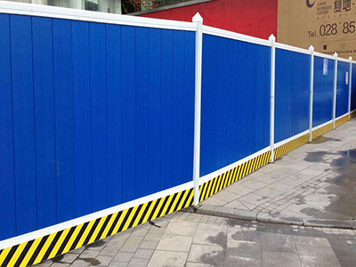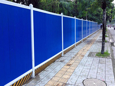 圍擋基腳采用M10水泥砂漿砌筑MU10頁巖磚磚砌0.5*0.5的基礎(chǔ),用于增強圍擋抗風(fēng)穩(wěn)定性;pvc圍擋設(shè)2.5米高,寬3米為一板。施工圍擋做美化處理,噴涂企業(yè)名稱、安全、質(zhì)量、文明施工用語及開發(fā)項目商業(yè)廣告,嚴禁張貼、涂寫垃圾廣告。