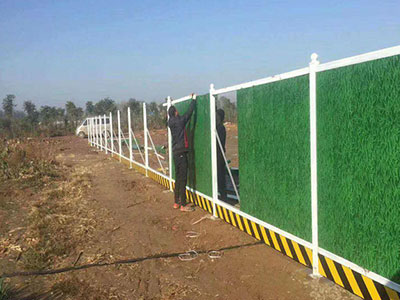 圍擋基腳采用M10水泥砂漿砌筑MU10頁巖磚磚砌0.5*0.5的基礎(chǔ),用于增強(qiáng)圍擋抗風(fēng)穩(wěn)定性;pvc圍擋設(shè)2.5米高,寬3米為一板。施工圍擋做美化處理,噴涂企業(yè)名稱、安全、質(zhì)量、文明施工用語及開發(fā)項(xiàng)目商業(yè)廣告,嚴(yán)禁張貼、涂寫垃圾廣告。